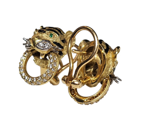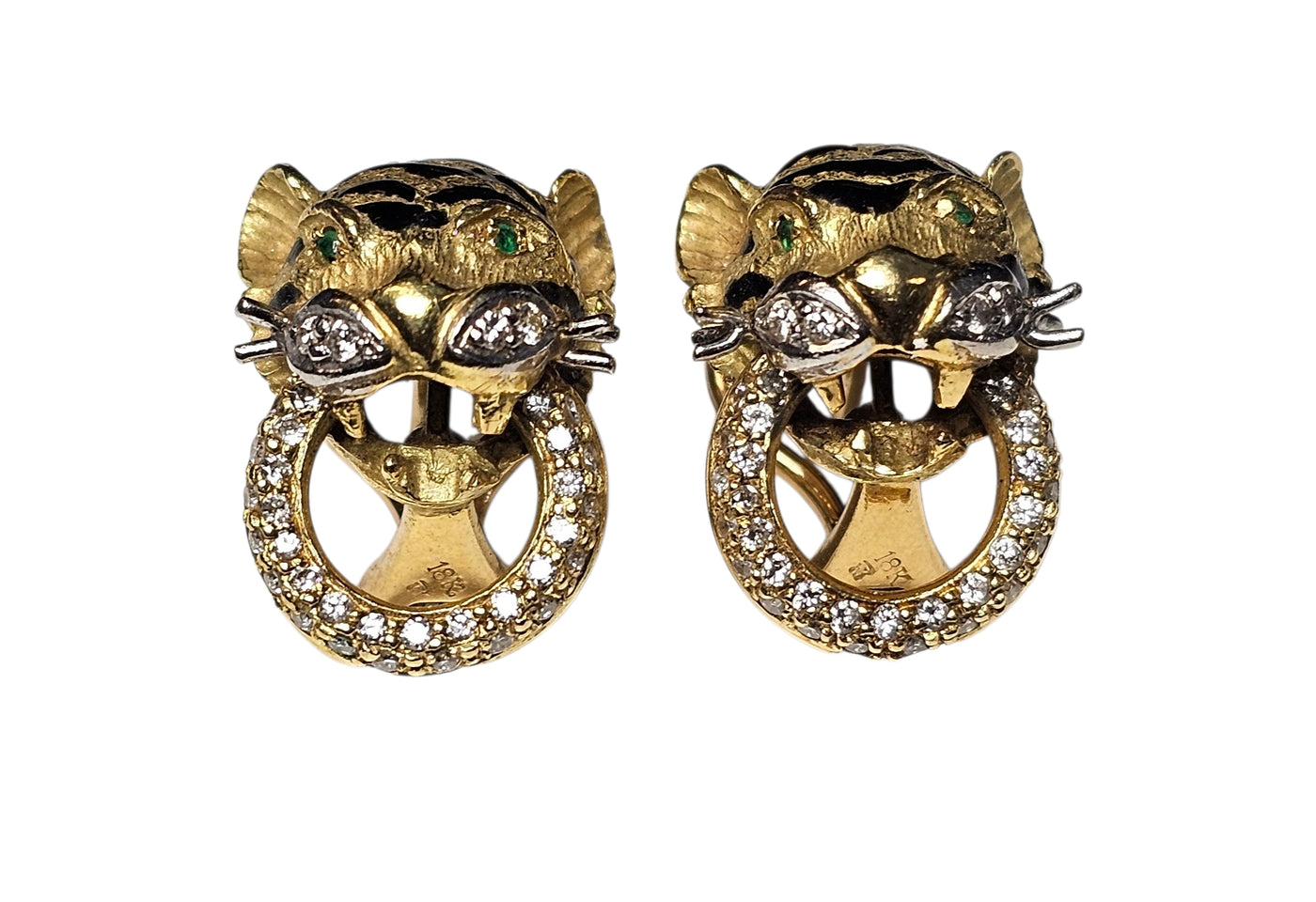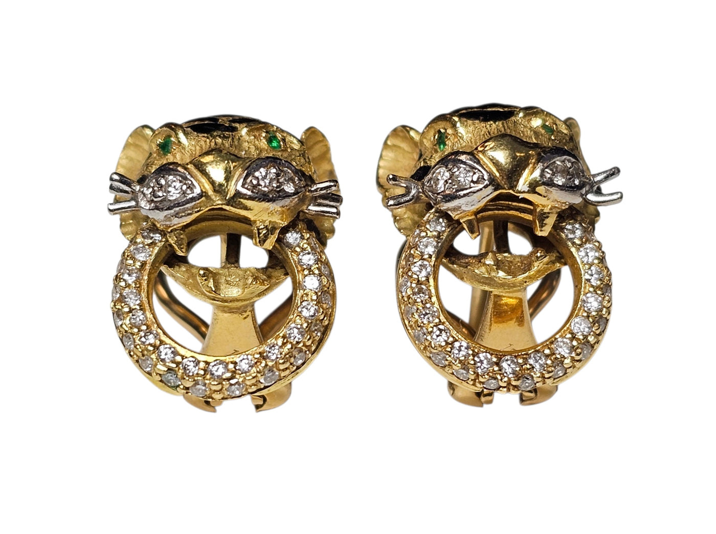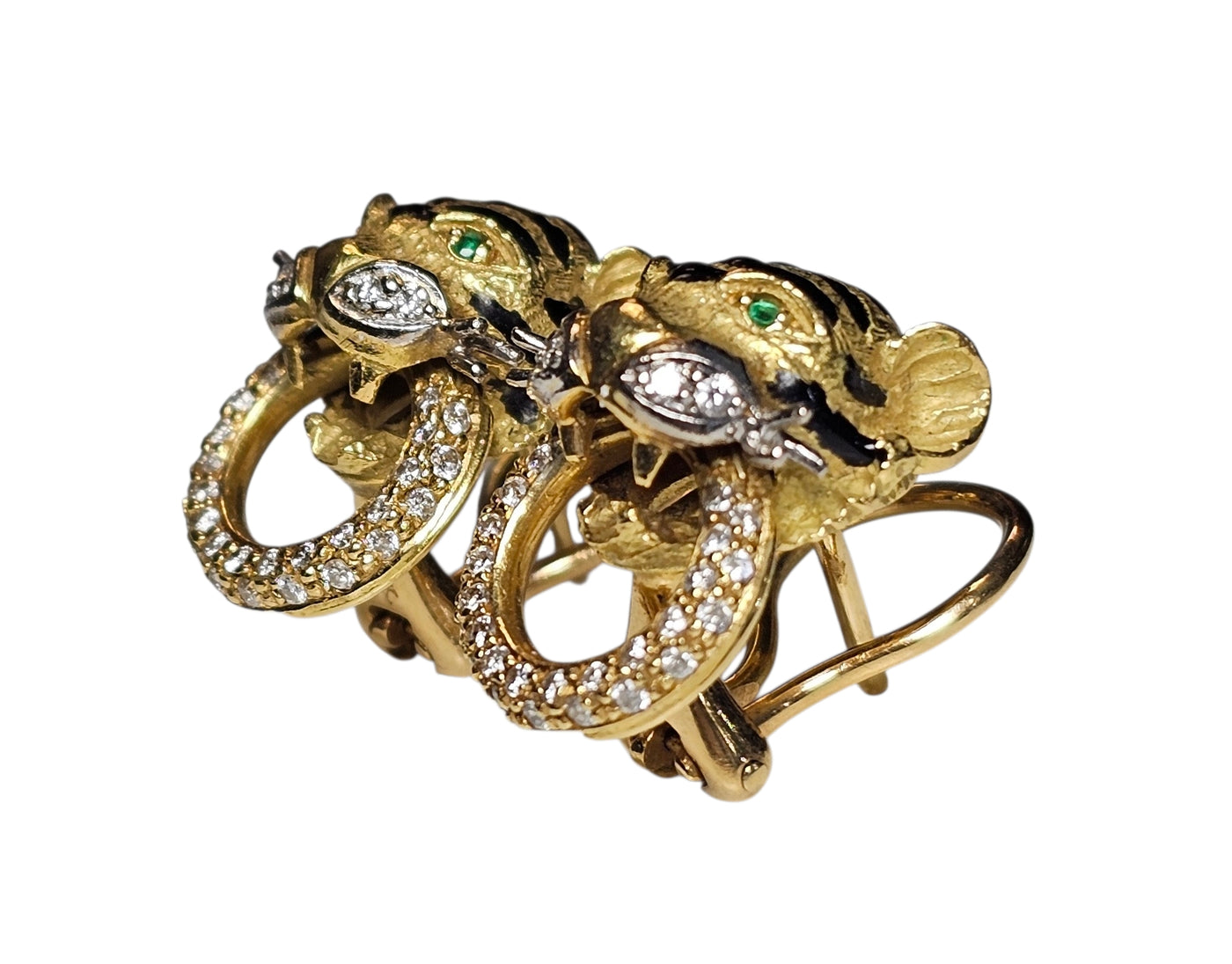 Emerald and Diamonds Tiger Head Earrings in 18K Yellow Gold