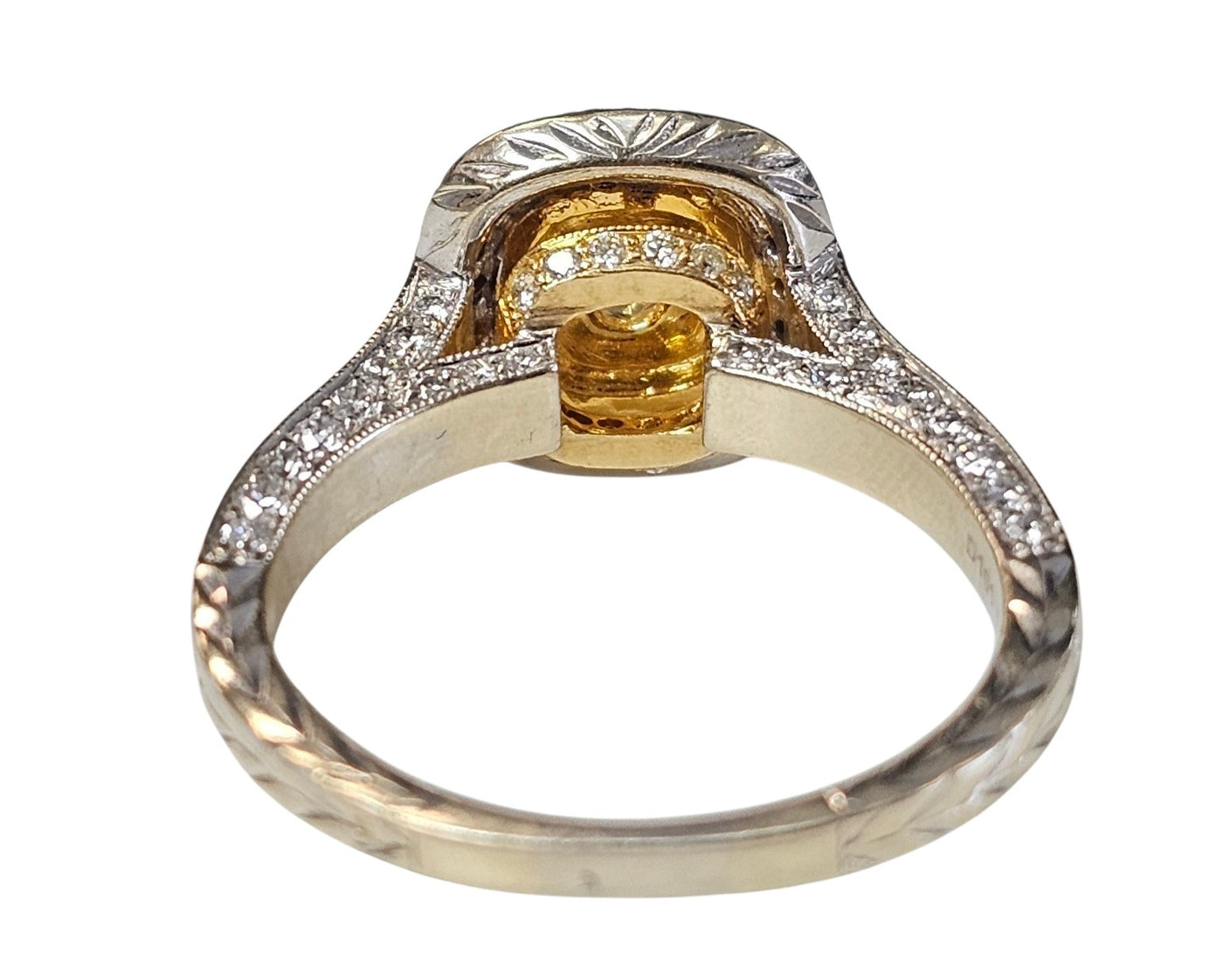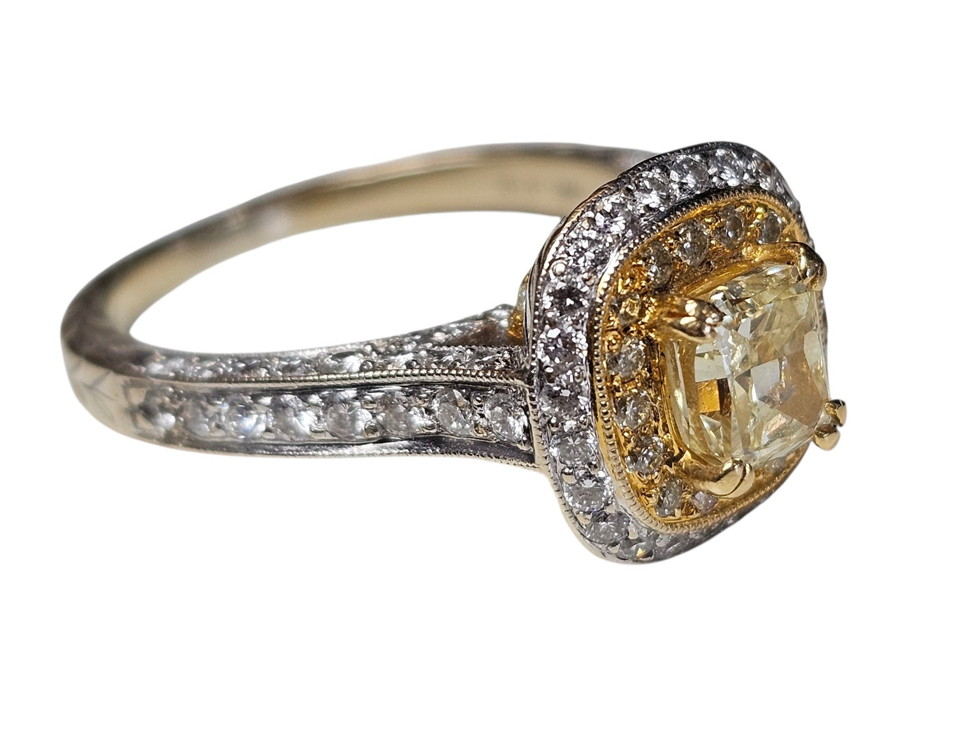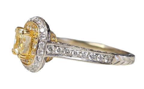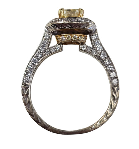 Fancy Yellow Cushion Cut Center Diamond w/ pave set round side diamonds