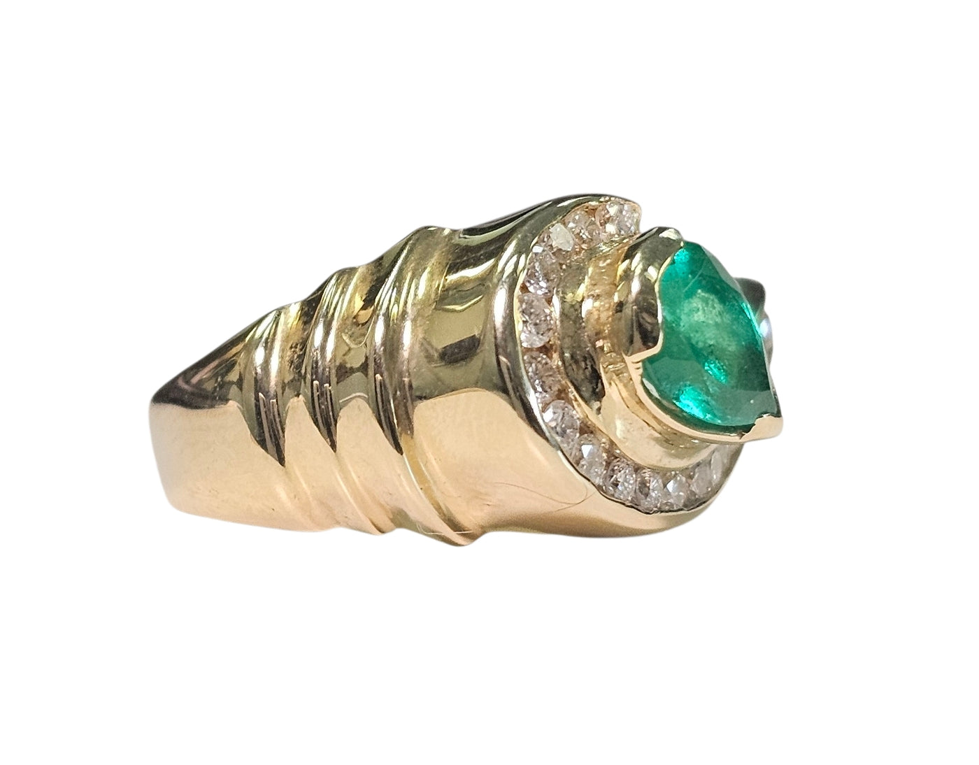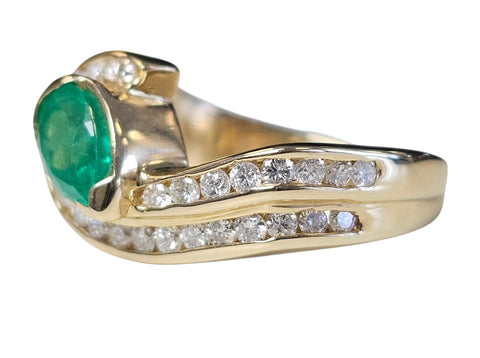 Pear Shape Columbian Emerald and Channel Set Diamond Ring made in 14-Karat Yellow Gold
