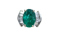 Oval-Cut Emerald and Bow Tie Style Baguette Cut Diamond Ring made in 14-Karat Yellow and White Gold