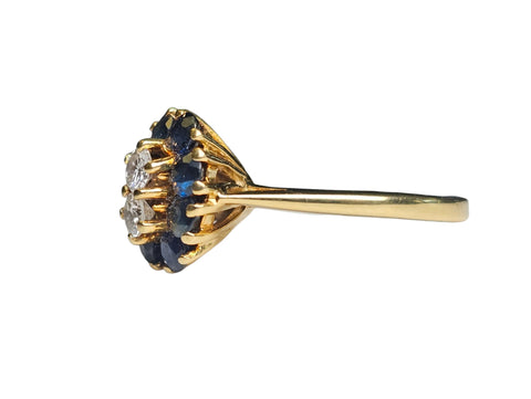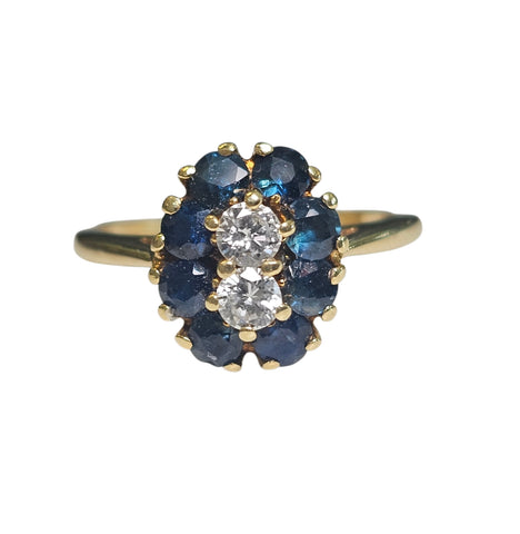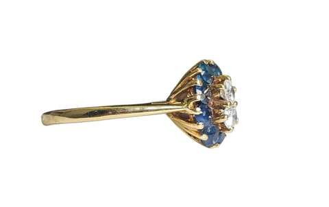 Double Diamond and Blue Sapphire Halo Ring made in 18Karat Yellow Gold