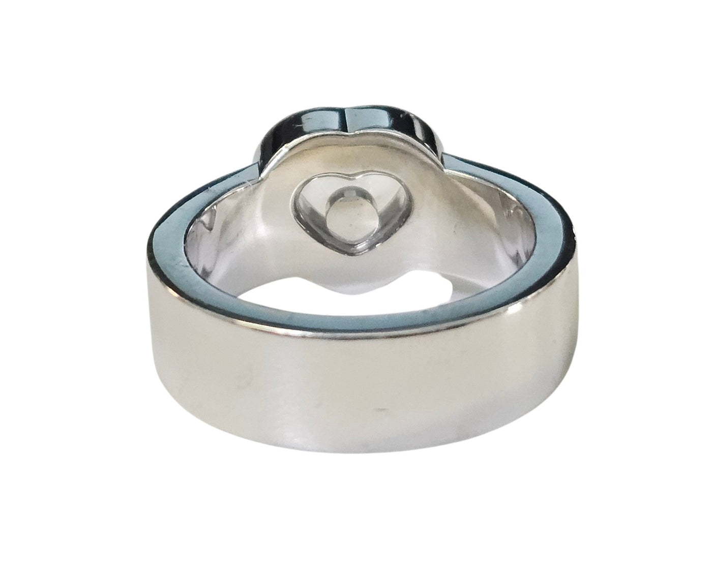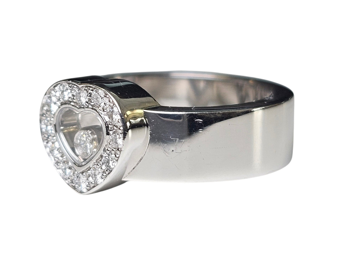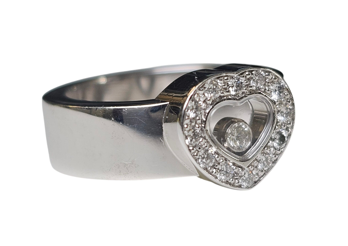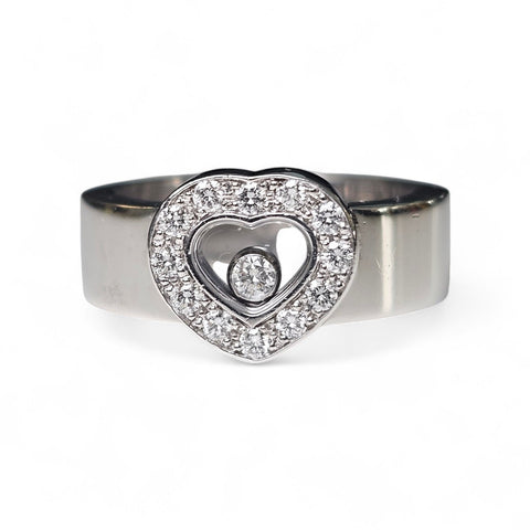 Exquisite authentic Chopard 18K white gold heart ring outlined in diamonds from Chopard's Happy Diamond collection.